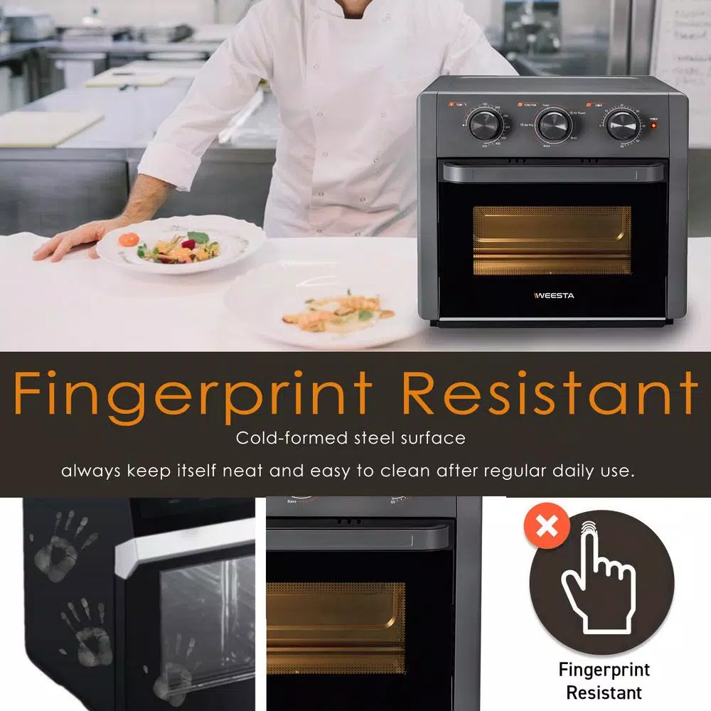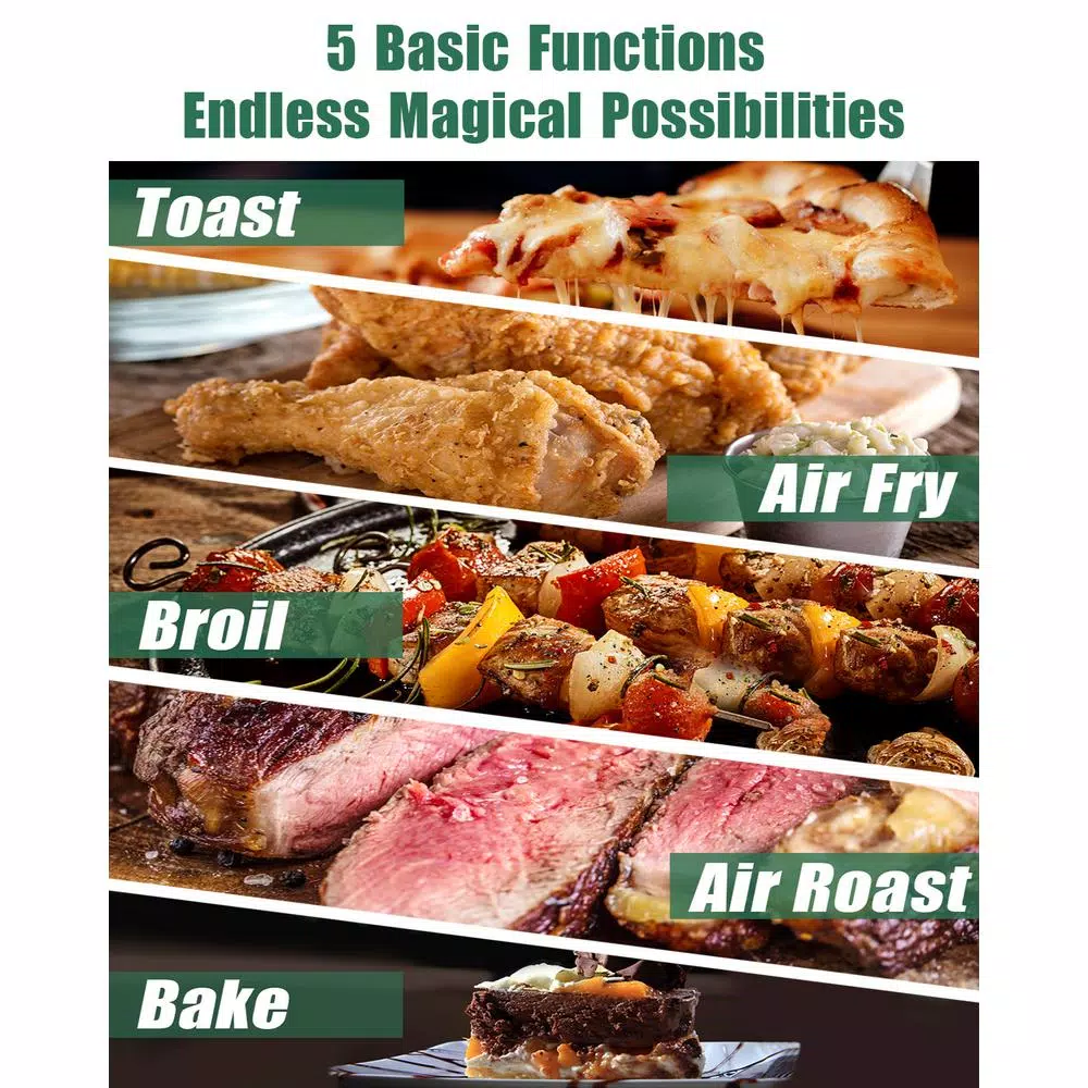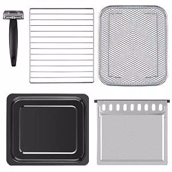 - Accessories Included: 1*Oven Rack, 1*Baking Pan, 1*Air Fryer Basket, 1*Oven Gripper, 1*Crumb Tray (pre-installed)