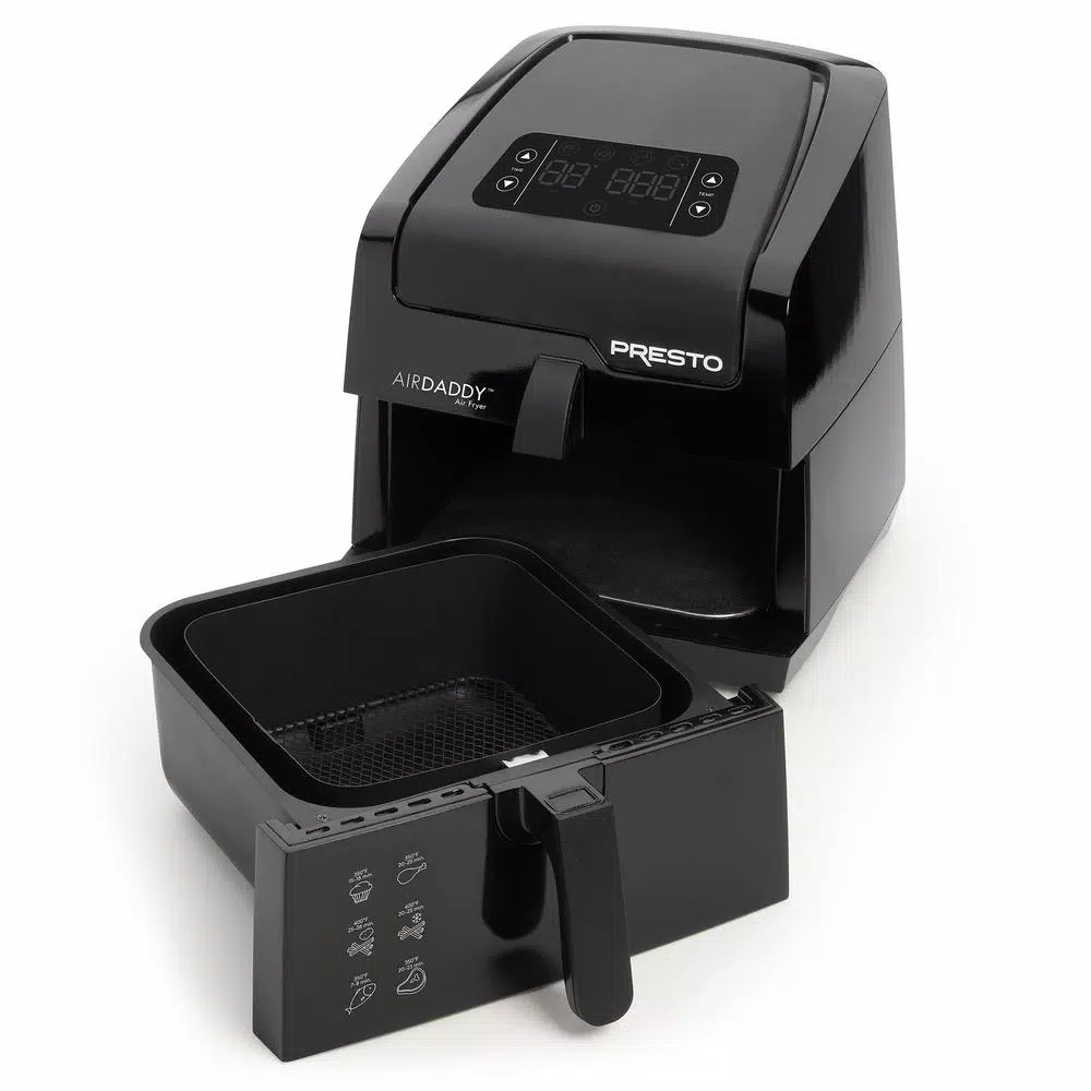 Fry with little or no oil. The digital AirDaddy electric air fryer makes french fries with up to 75% less fat. Large removable 4.2-quart basket. Use the air fryer for french fries, snacks and appetizers, meats, poultry, seafood, and vegetables. It even bakes cakes and muffins! AirDaddy utilizes a convection cooking system to circulate hot air in every direction for foods that are crispy outside and tender inside. Large digital touch screen, temperature up to 400 and time up to 60 minutes. Or popular presets for fries, meat, fish, and chicken. Digital timer with automatic shut-off signals when cooking time is done. A handy menu guide provides quick reference to cooking times and temperatures for many popular foods. Pan and basket are fully immersible. Cool-touch exterior wipes clean. Built-in cord wrap