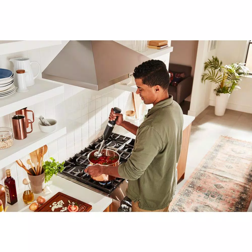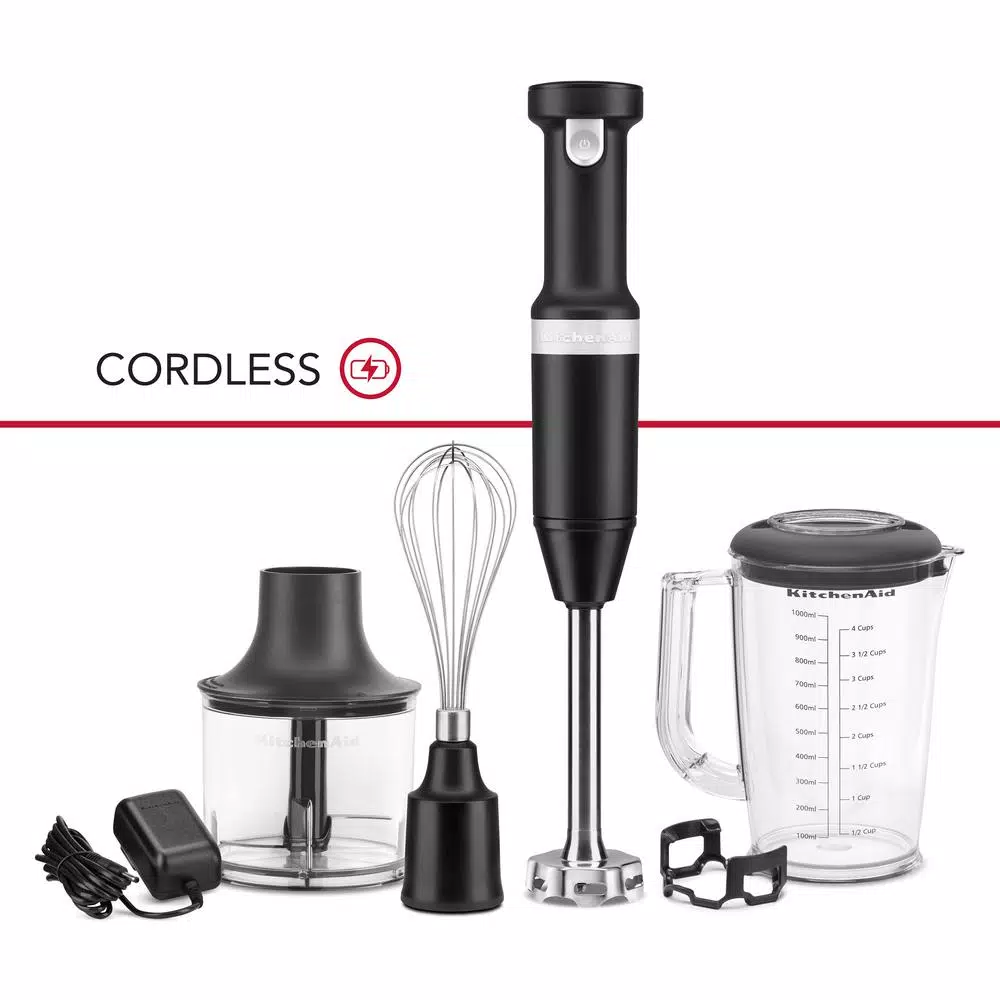 All the Power You Expect, without the Cord. Go where ambition takes you with the Cordless Hand Blender from KitchenAid. Designed with a powerful rechargeable Lithium Ion Battery, the new cordless hand blender delivers optimal runtime and performance, so you can cook wherever, whatever, and however you choose. Blends 25 bowls of soup on a full charge.Indoor use only. Based on 12 oz. bowls (354 ml), 7 batches, Tomato Basil Soup.All the power you expect, without the cord.
