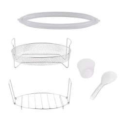- 5-accessories and recipe book included: we’ve included 5 accessories to maximize your pressure-cooking options, accessories include a measuring cup, 2 serving spoons, oval mesh basket, and flat steaming rack, enjoy 50 step-by-step recipes to get you started with your new kitchen gadget