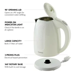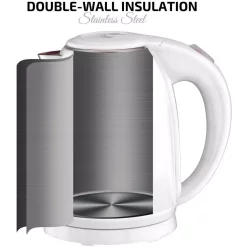 - FAST & ECO-FRIENDLY 1.7L BPA-Free Electric Kettle with 120V, 1100-Watt power, and double-wall construction boils water faster and uses far less energy than stovetop kettles. It also keeps your water hot much longer.