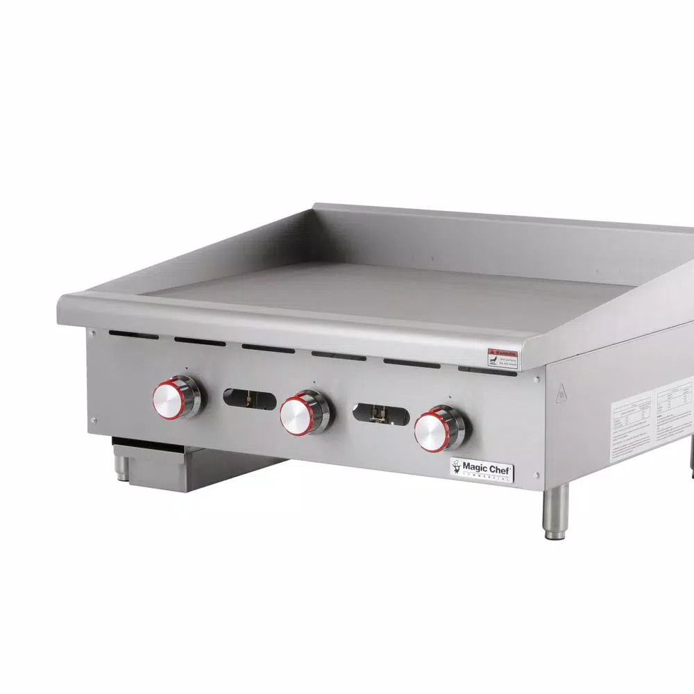 The Magic Chef Commercial 36 in. wide thermostatic countertop griddle is an efficient and durable addition to a commercial kitchen. The cooking surface is 24 in. deep; with the cooking surface in total an ample 856.8 sq. in. The burners are u-shaped and are placed every 12 in. for efficient heating. The temperature probe is embedded for more accurate cooking performance. Back and side splashes are stainless steel and are designed to help keep your work environment cleaner. Includes a drip tray for easy cleaning Adjustable legs allow you to customize the height according to your food prep needs.