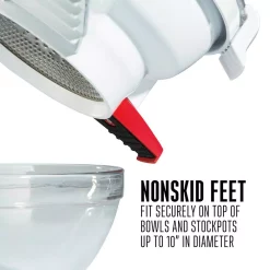 - Nonskid feet fit securely on top of bowls and stockpots up to 10 in. Dia