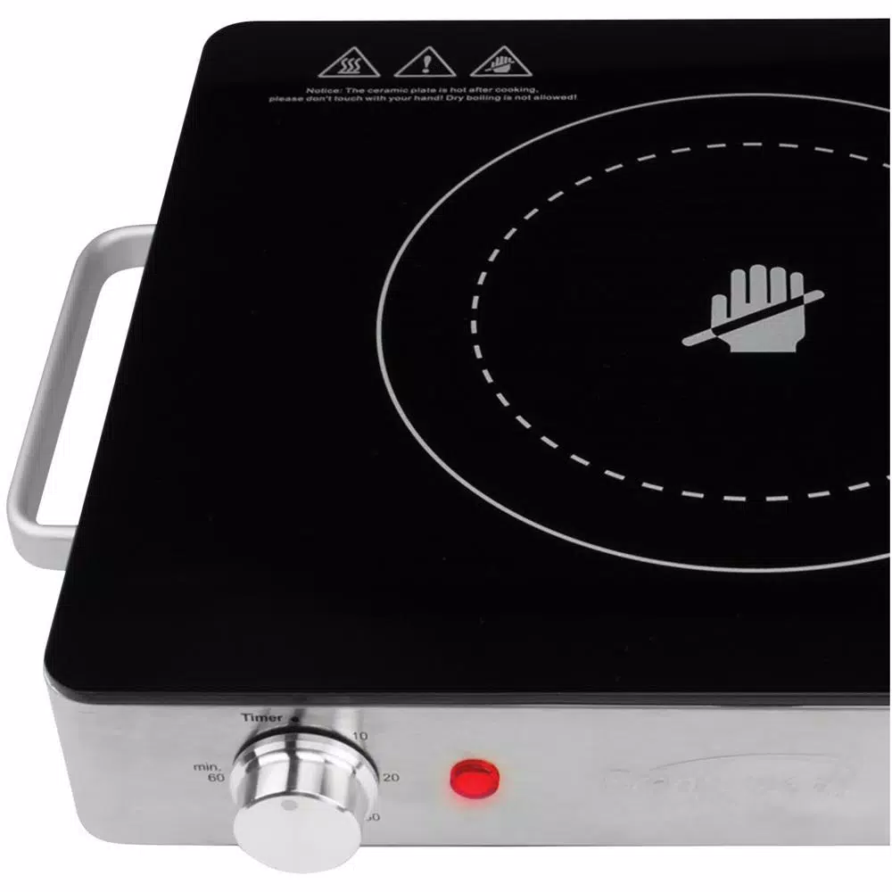 The Brentwood Appliances TS-381 Single Infrared Electric Countertop Burner rapidly cooks food with any type of cookware. Food stays juicy and holds more nutrients thanks to faster and hotter infrared heating. This electric burner has adjustable heat, 60 minute timer with auto shut off, power indicator light and durable stainless steel housing. This convenient burner has an easy-to-clean, ceramic glass surface and looks great on every countertop.