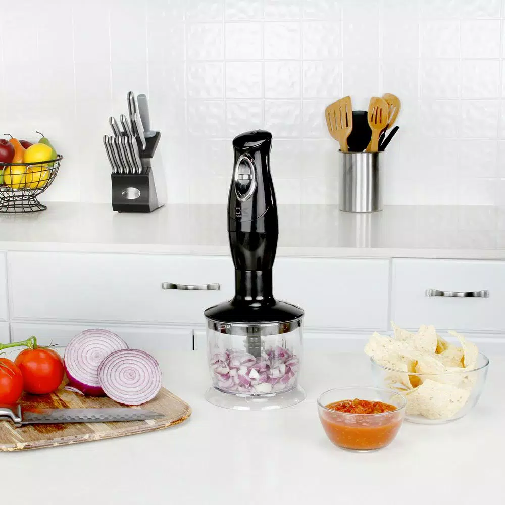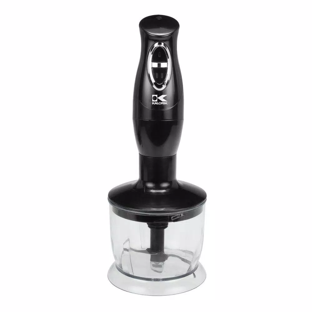 This 3-in-1 mixing set by KALORIK is the perfect marriage between function and design. Keep everything needed for quick food prep neatly organized and within reach thanks to this three -in-one combination stick mixer. The unit provides a handle with a decorative chrome panel for a secure grip and a long stainless steel shaft that reaches effortlessly into a pot for pureeing soup or into the mixing cup provided for blending up protein shakes or fruit smoothies. Best of all, the appliance converts from a stick mixer to a whisk with a simple twist, to make homemade whipped cream or tasty mayonnaise, and it can be attached to the included chopper for chopping up green pepper, onion, garlic, and more in seconds. The full mixing set with its entourage of accessories stores elegantly with the help of its convenient holder.