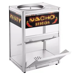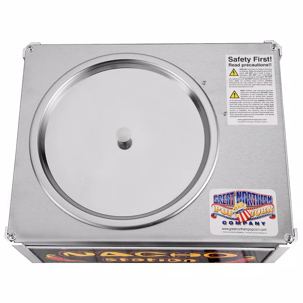 If you are looking for a commercial grade Nacho Warmer, look no further. Great Northern Popcorn Company is pleased to offer you this this cabinet-style countertop warmer, perfect for those sporting events, fund raisers, or concession stands. These premium nacho warmers can also be used for popcorn, as well as nacho chips or peanuts. The Nacho Station holds approximately 10-lbs. of nacho chips. The Great Northern Nacho Station is top loaded, and utilizes an innovative deflection board to prevent nacho breakage. A 100 watt heating element in the base and a 60 watt warming light work together to keep the contents warm and fresh. Constructed of stainless steel with tempered glass for years of rugged use and cleaning.