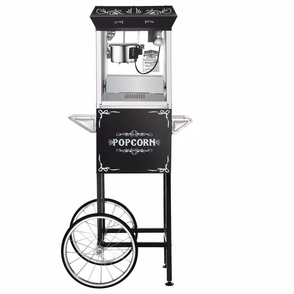 - PRODUCT DETAILS-Material: Metal, Stainless Steel & Polycarbonate Door. Dimensions: 27.5 L x 18 W x 57 H inches; 43lb. Machine: 17.1 L x 14.1 W x 20.8 H inches. Cart: 27.5 L x 18 W x 36.6 H inches. Includes: 3 Plastic Cups, 25 Popcorn Bags & Scoop. 110V 640W ETL Approved.