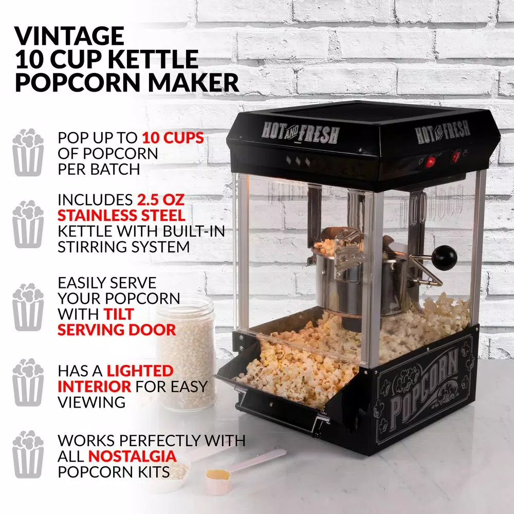 Bring the family together for movie night with its vintage look reminiscent of the silent movie house and carnivals of the 1900s. The large 2.5-ounce kettle with dual-hinged lid and built-in stirring system pops delicious crunchy popcorn. Featuring tempered glass windows and door, a lighted interior allows you to watch each batch pop to perfection. The tilt door allows for easy access serving. Popcorn has never tasted so good at home.