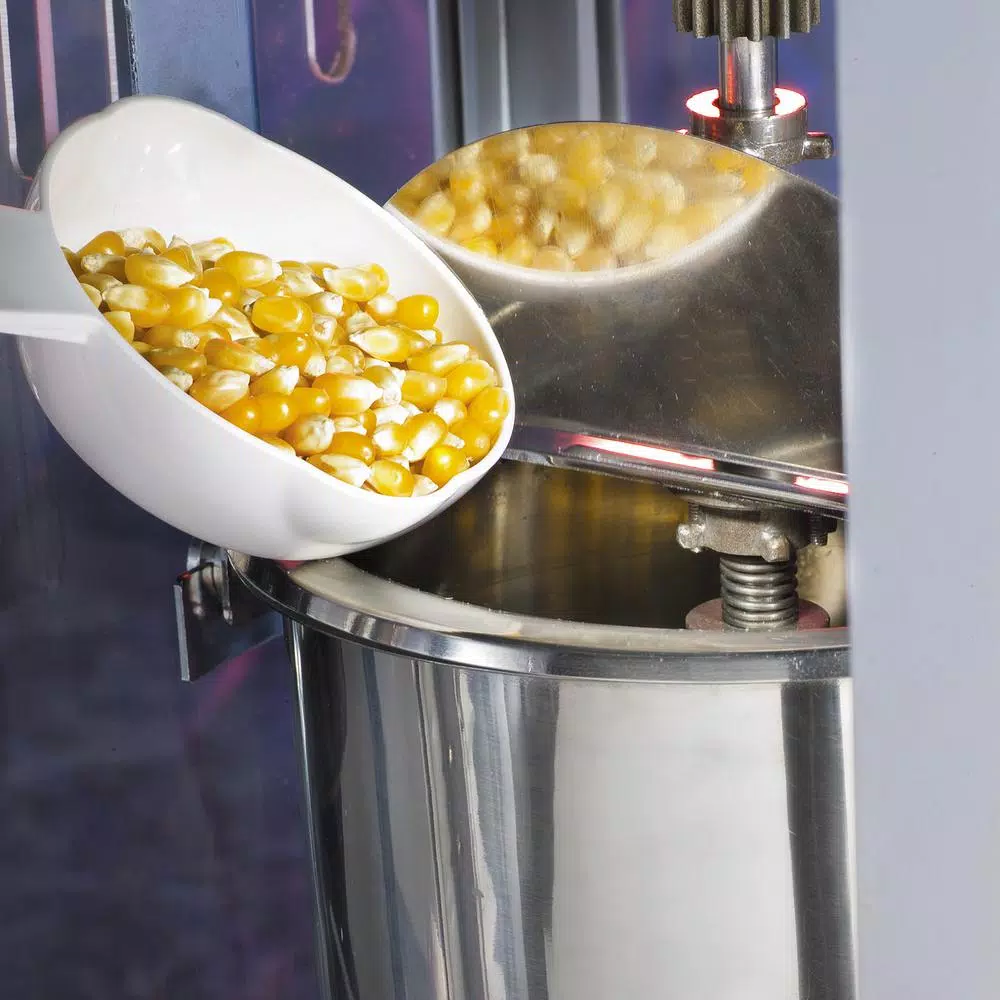 - 2.5 oz. kettle: stainless steel kettle holds 2.5 oz. of popcorn kernels and is designed with a built-in kernel stirring system and dual-hinged lid to easily empty popcorn
